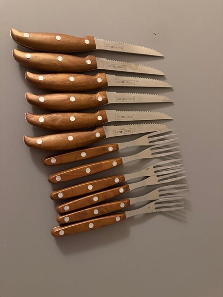 Detta är ett set med Royalty Line biffknivar och gafflar med handtag i träimitation.