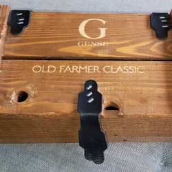 Handtagen har en klassisk design i träimitation med vita nitar.