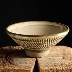 Sked av oglaserad bisqueporslin med en rå, sandfärgad yta och traditionell asanoha-dekoration.
