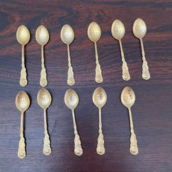 Set med guldfärgade skedar. Perfekt för kaffe eller dessert. Två små skedar har börjat att tappa bort lite färg. Annars bra skick.