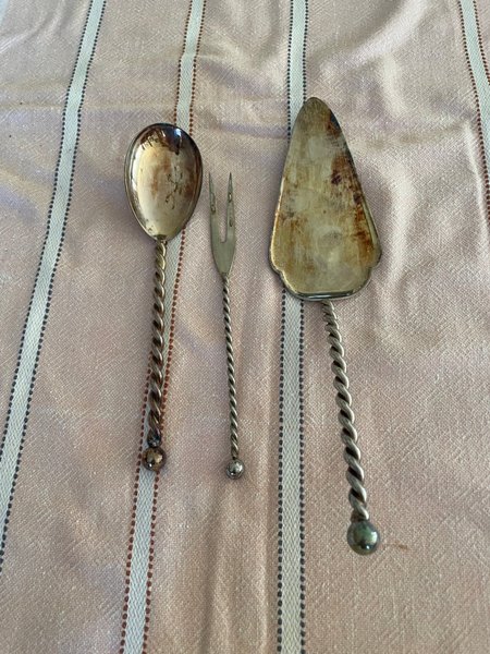 Set med serveringsbestick i silverfärg. Innehåller en sked, en gaffel och en tårtspade. Alla delar har tvinnade handtag.