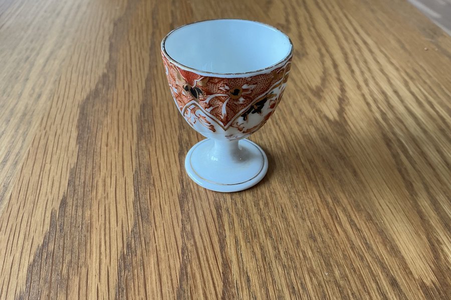 Äggkopp i porslin med mönster i rött, svart och guld. Äggkoppen har en vit insida och en guldkant runt foten.