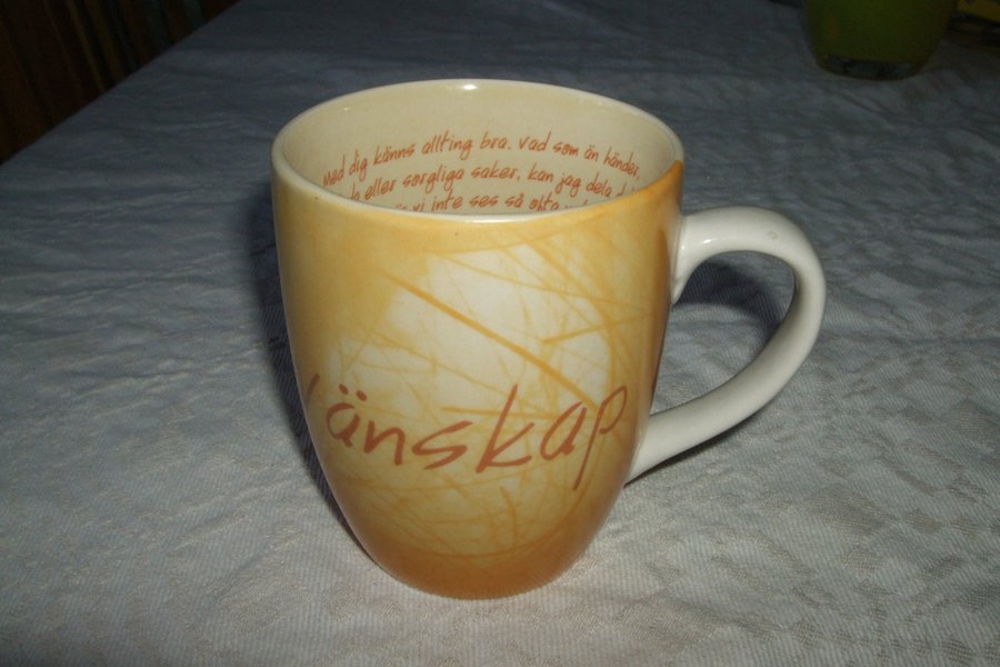 En mugg med texten "Vänskap" på utsidan och ett citat på insidan. Muggen är i färgerna gul och vit.