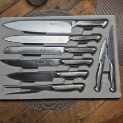 Ett set med köksknivar. Inkluderar bland annat en IKEA 365+ kniv och en kniv från Lidl.