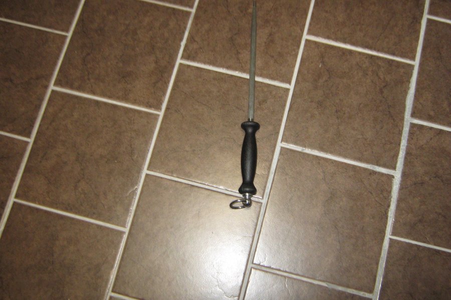 Bryne /Knivslip med svart handtag. Längd på bryne 23,5cm med skaft 37cm.