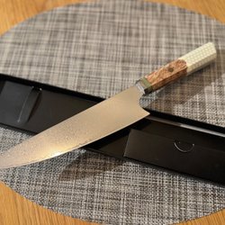 Kockkniv i rostfritt stål. Kniven har ett ergonomiskt handtag och en vass egg. Den är lämplig för att skära kött, fisk och grönsaker.