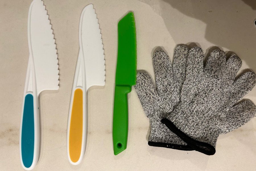 Tillhörande skyddshandskar för när man sen vill prova på riktiga knivar.