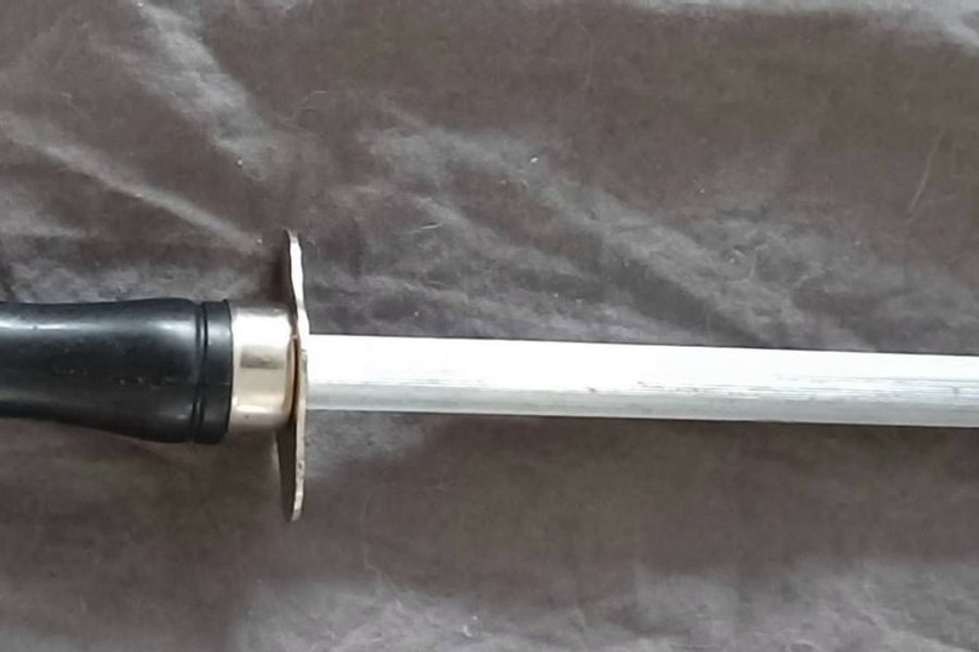 Knivslip med svart handtag och metallring för upphängning. Slipstålet är räfflat.