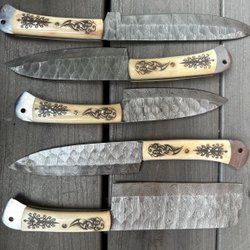 This set of chef's knives features a distinctive pattern on the blades and dark wood handles with light-colored accents at the base. The set includes various knife types suitable for different kitchen tasks.