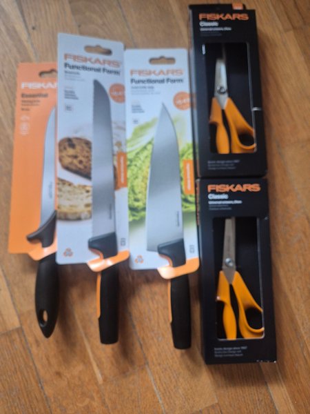 Fiskars Functional Form brödkniv, Fiskars Functional Form kockkniv, Fiskars Essential universalkniv och två Fiskars Classic universalsaxar.