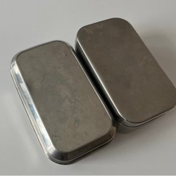 En rostfri med låsning av locket. 16x12x5. (17cm inkl knäppena)