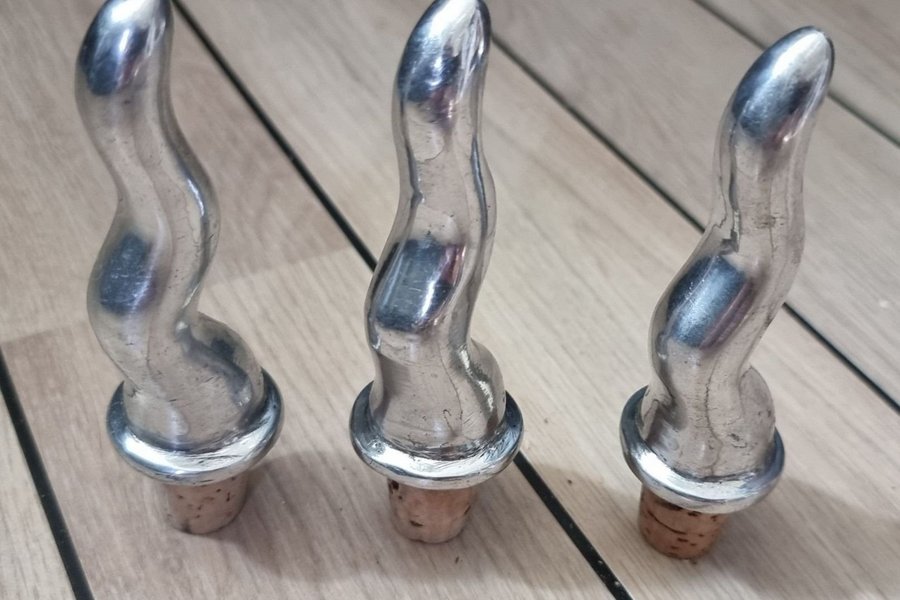 Tre unika flask/vinproppar i metall och kork.