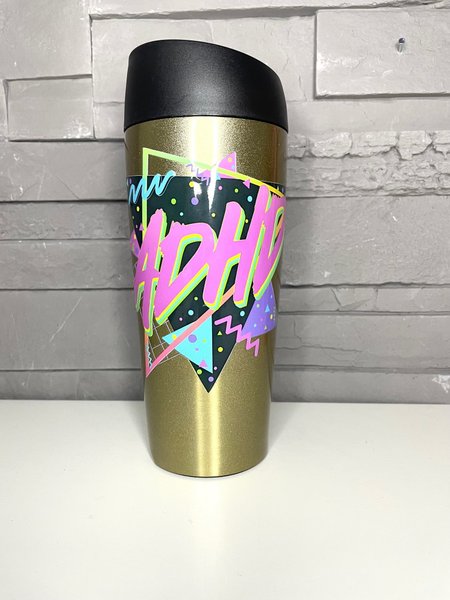 En resemugg med ett färgglatt ADHD tryck.