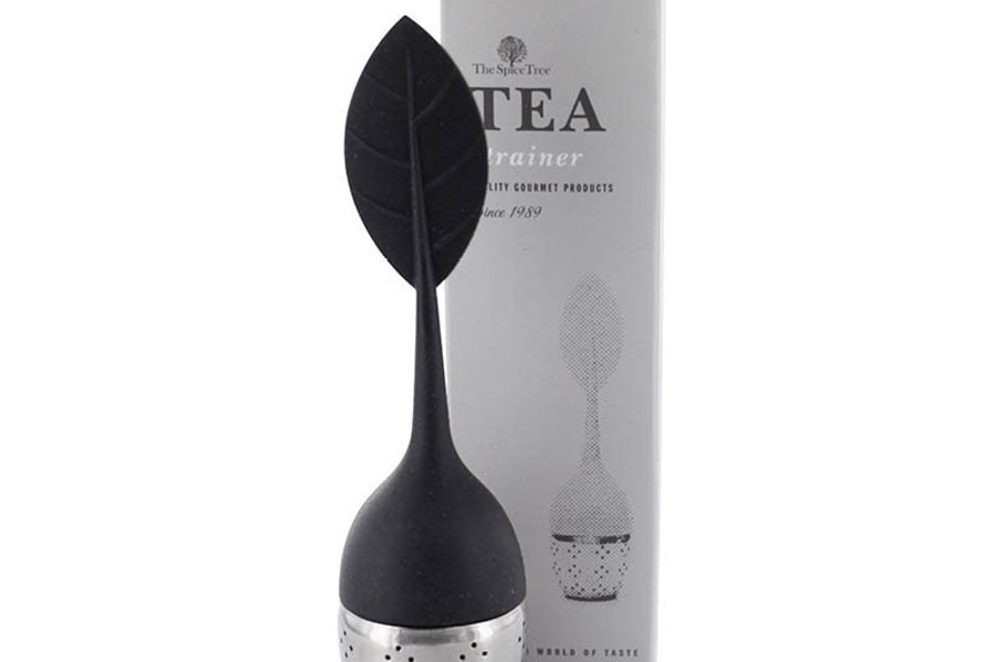 Fin svart tesil med formen av ett löv från The Spice Tree rostfritt och silikon. Tesilen står på en rund liten passande silikonplatta. Levereras i en grå presentförpackning, se bild. Perfekta gå-bort presenter att ha hemma.Kan levereras Höör- Ludvigsborg- Hörby