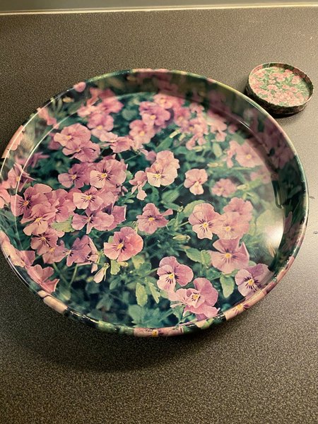 Bricka med blommor och små underlägg till glas. Ev 70-tal. Brickan har några repor.