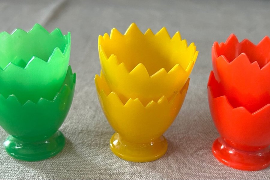 Färgglada äggkoppar i plast. Perfekta för påskfrukosten eller för att liva upp vilken frukost som helst. Setet innehåller äggkoppar i grönt, gult och orange.
