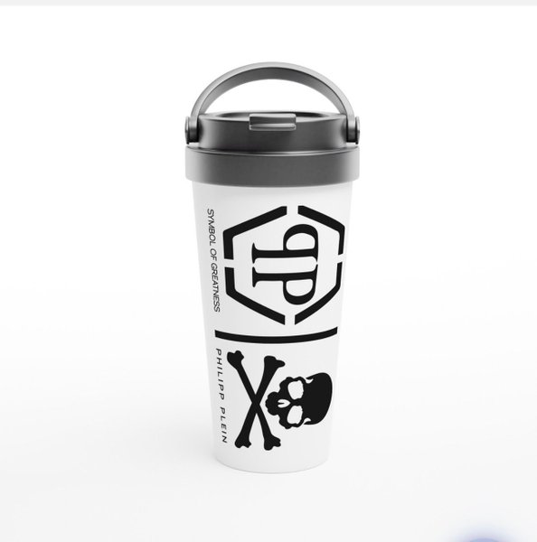 Vattenflaska med Philipp Plein-logotyp och texten "SYMBOL OF GREATNESS" samt en dödskalle-design. Make it by gelato