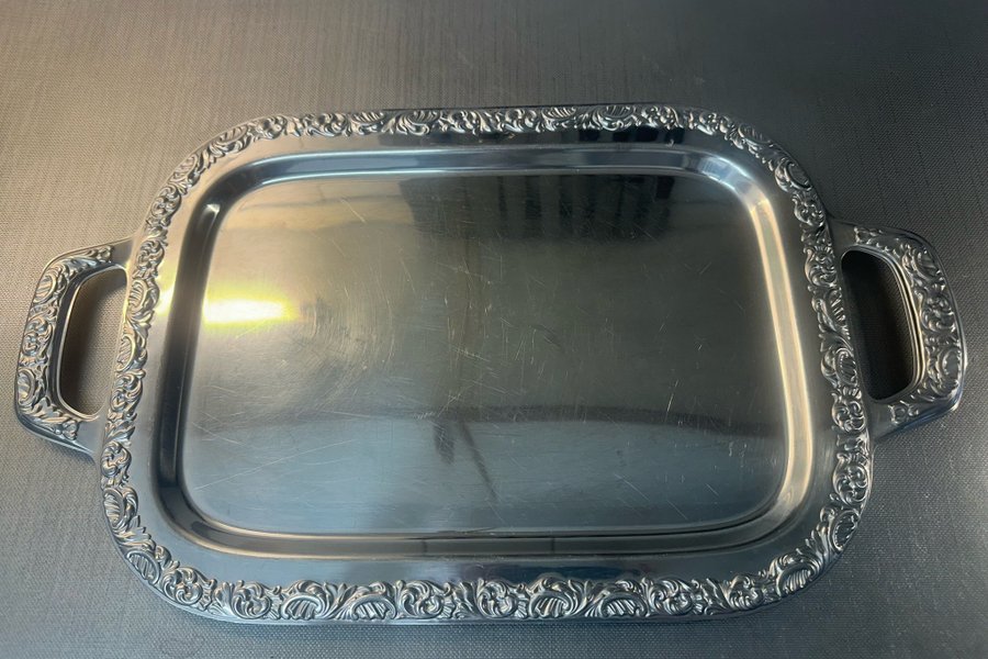 Serveringsbricka i metall med handtag. Brickan har en rektangulär form med rundade hörn och en dekorativ kant. 41x30 cm utan handtag.