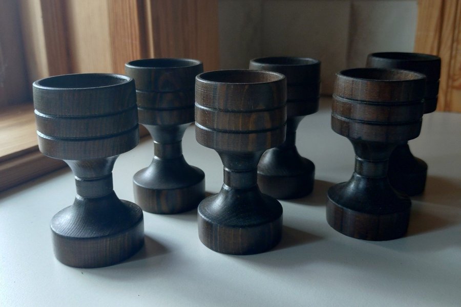 6 st fina svarvade äggkoppar i mörkbrunt trä från 1970-talet.