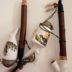 Set med fyra ölmuggar med lock. En av muggarna är i klarglas med ett färgglatt vapensköldsmotiv. En annan mugg har ett detaljerat motiv av en byscen med människor. De två andra muggarna är i keramik, varav en är mörkblå med texten "Hopfen u. Malz Gott erhält's" och den andra har ett blåvitt rombmönster.