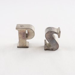 Ett set med salt- och pepparströare. Den ena ströaren är vit och den andra är silverfärgad. Båda har proppar undertill för enkel påfyllning.