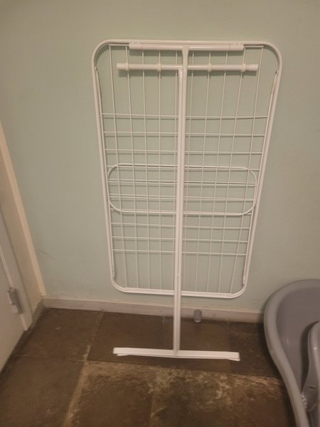 Torkställning i vit metall. Hopfällbar design för enkel förvaring. Perfekt för att torka kläder inomhus.