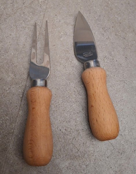 Ostbestickset. Setet innehåller en ostkniv och en ostgaffel, båda med trähandtag.
