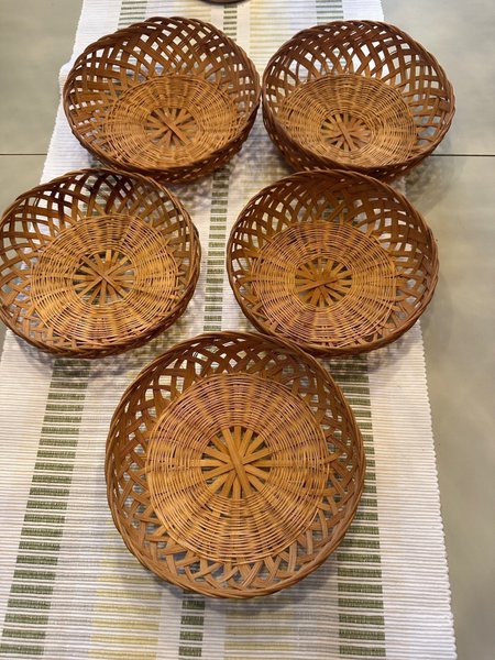 Fem stycken korgar. 3 st som är ca 18 cm2 i diameter och 2 st ca 17 cm i diameter. Alla är i fint skick. Kan användas till att servera bröd/fika alt förvaring.