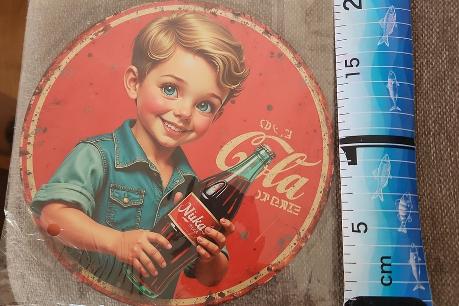 Plåtskylt med Cola-motiv. Skylten är rund och har ett motiv av ett barn som håller i en Nuka Cola-flaska. Den har en diameter på 20 cm
