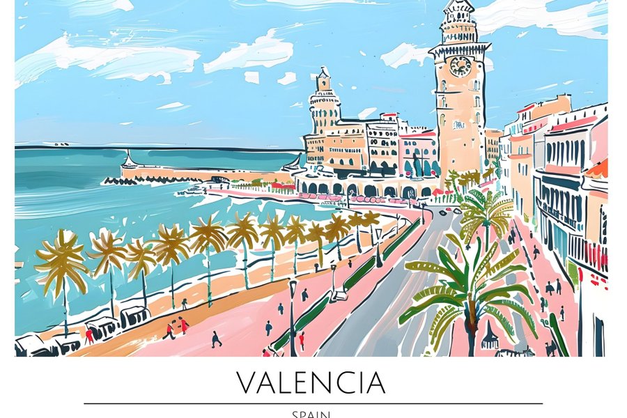 Ett vackert konsttryck som föreställer Valencia i Spanien. Perfekt för att ge ditt hem en touch av medelhavskänsla.