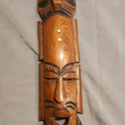 Dekorativ trämask med upphängningsanordning. Längd ca 20 cm.