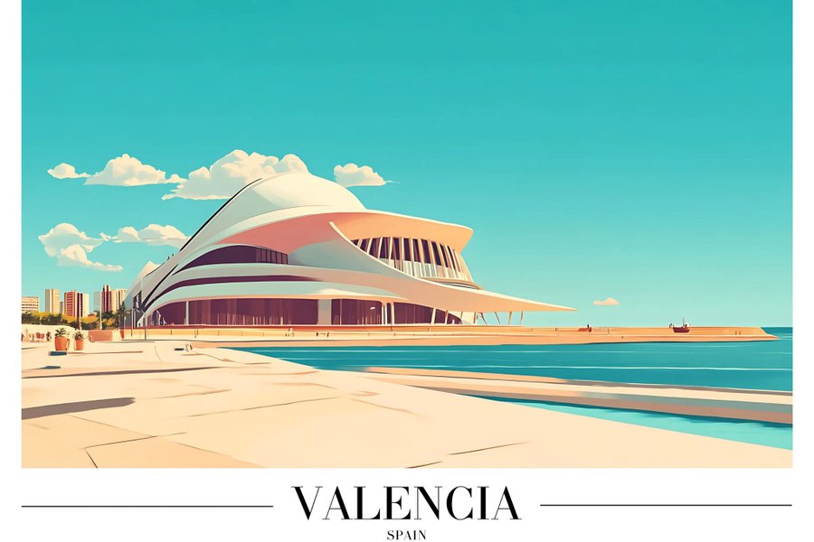 Poster med motiv av en byggnad vid vatten i Valencia, Spanien. Färgerna är ljusa och klara, med en turkos himmel och vatten. Byggnaden har en modern arkitektur med svepande linjer i vitt och beige. I bakgrunden syns några mindre byggnader och moln på himlen.