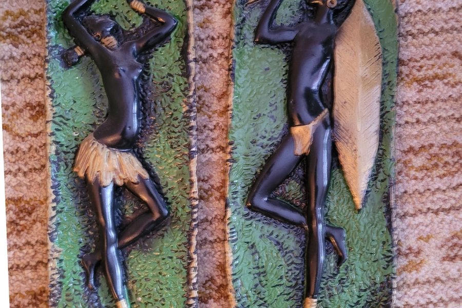 Två väggdekorationer med motiv av liggande figurer på en grön bakgrund. Retro 60-70 tal fint skick.