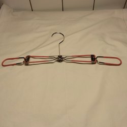 Ett set med fyra vintage galgar i olika färger: gul, blå, grön och röd. Varje galge har en unik design med en metallkrok och en färgad repdetalj.