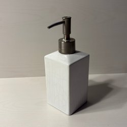 Elegant tvålpump för badrum eller kök. Tillverkad i polyserin med detaljer i trä och metall.