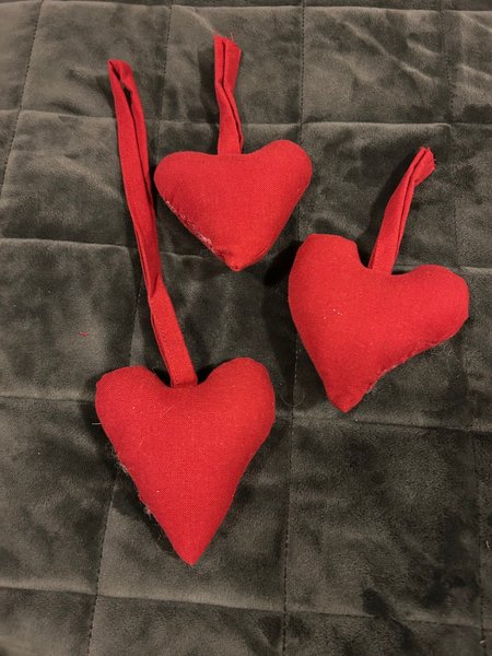 Dekorativa hjärtan. Fyllda med bomull. Kan hängas upp på krok eller alla i ett träd som man har inne.