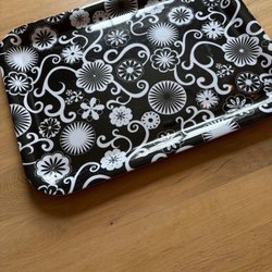 Dekorativ bricka med blommigt motiv och text.