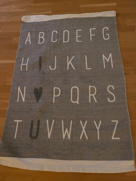 En fin matta med alfabetet. Ljusgrå med vit text. Perfekt för barnrummet eller lekplatsen. Mått 88x129 cm