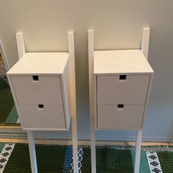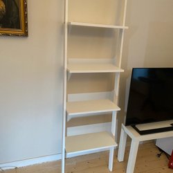 Två vita stegar i trä.stegarna har flera stegpinnar och kan användas för olika ändamål. Den är lämplig som handdukshängare i badrummet eller som en dekorativ inredningsdetalj i andra rum.ev stöd till växter höjd 150 bredd 32