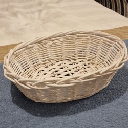 En fin korg i flätat material. Passar bra som inredningsdetalj. diameter ca 19 cm upptill, botten är ca 15 cm 9,5 cm hög