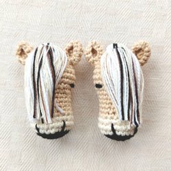 Två virkade kor i rödbruna och vitt bomullsgarn.