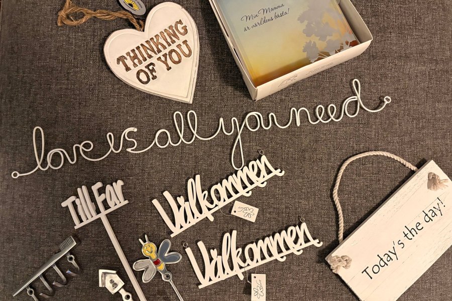 Skyltar med budskap: Till far, Thinking of you, Today’s the day, Love is all you need, Min mamma är världens bästa och Välkommen x2.