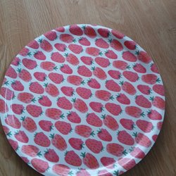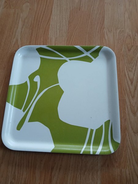 Serveringsbricka i rektangulär form med rundade hörn. Brickan är vit med ett grönt mönster som täcker delar av ytan.