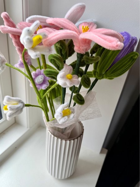 Disse piberenserblomster er et farverigt indslag i ethvert rum. Buketten består af lyserøde, lilla, hvide og grønne piberensere, formet som blomster og blade.