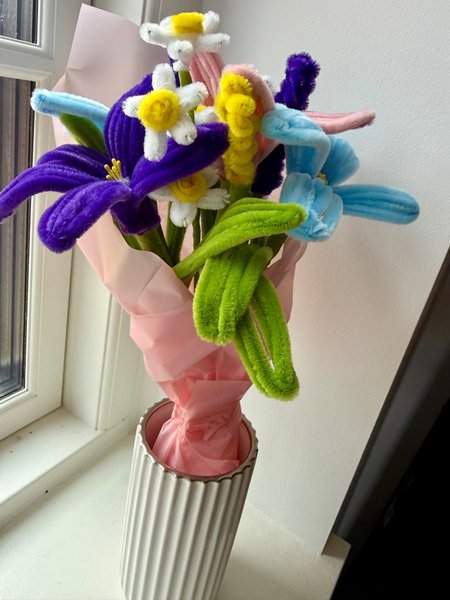 Disse piberenserblomster er et farverigt indslag i ethvert rum. Buketten består af lyserøde, lilla, hvide og grønne piberensere, formet som blomster og blade.