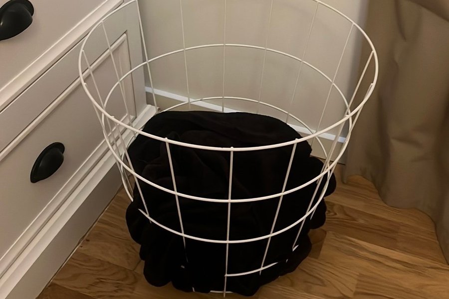 Vit metallkorg med en stilren design. Perfekt för förvaring av filtar, tvätt eller leksaker. Korgen är tillverkad av robust metalltråd och har en öppen design som gör det enkelt att se innehållet.