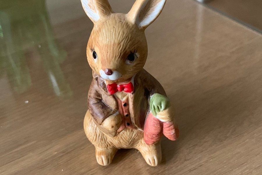 En charmig kaninfigur klädd i kavaj och fluga, hållandes en morot. Perfekt som dekoration eller samlarobjekt.