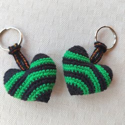 Två virkade kor i rödbrunt och mörkbrunt bomullsgarn.
