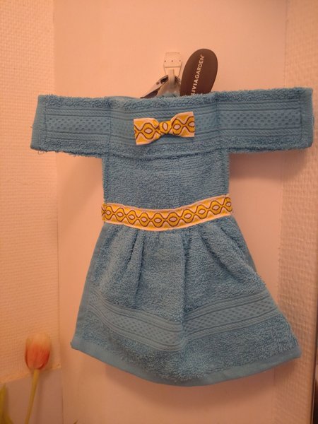 Sytt av frottehanddukar i form av klänning.