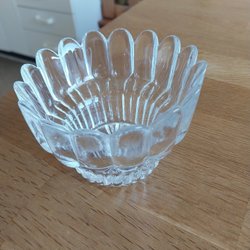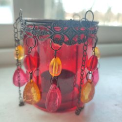 Ljuslykta i mässingsliknande material med utskurna detaljer. Lämplig för värmeljus. Höjd 6 cm.